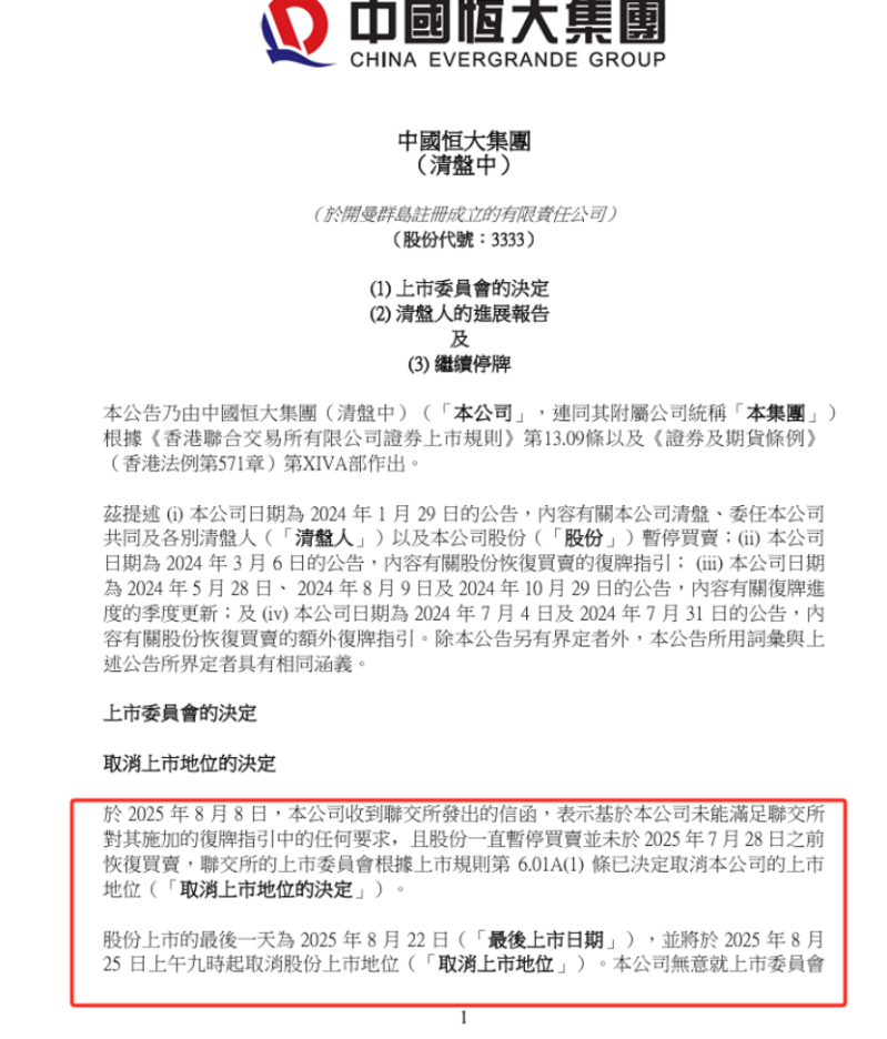 中國恒大集團公告。 上述上市規則第6.01A(1)條主要涉及港交所快速除牌規則,即主板連續停牌達18個月、創業板連續停牌達12個月,可直接取消公司的上市地位,隨時刊發除牌通知。 作為港股主板上市的中國恒大,從2024年1月29日起停牌至今已經連續停牌達到18個月,觸及了上述紅線。 根據安排,中國恒大股份上市的最後一天為2025年8月22日,并將於8月25日上午九時起取消股份上市地位。 對於股東和投資者影響,中國恒大表示,在最後上市日期後,儘管股份的股票仍然有效,但是股份不會在港交所上市和買賣,此後,該公司將不再受港交所上市規則管控。 唏噓:港交所上市不過16年 曾經作為中國最大規模的房地產公司之一,中國恒大市值一度高達3700億港元,最終走向退市令人唏噓。因債務及持續經營壓力,中國恒大控股子公司恒大汽車此前曾尋求引入新的戰略投資者,經歷多番波折,最終重組宣告失敗。 目前中國恒大仍處於清盤程序中,被除牌僅代表其不再是香港上市公司,不會直接影響恒大汽車、恒大物業的上市地位和恒大物業的正常運營,在法律層面上亦不影響中國恒大境內外債權人行使權利。清盤人將繼續履職,保全及變現集團資產,以保障債權人利益。 同時,據恒大的清盤人公佈的首份進展報告披露,相較於整體資產負債表,迄今為止的變現金額雖然有限,但仍可觀,目前的變現金額合計約20億港元。其中,僅有約8170萬港元來自該公司直接持有資產,餘下約19億港元來自附屬公司持有資產。 事件回顧: 2009年11月,中國恒大在港交所上市,成為在港上市最大的內地民營房企。 2017年,恒大市值一度高達3700億港元,助推許家印成為當時中國首富。 2021年恒大財富爆雷,後續中國恒大開啟資產重組等動作。 2023年7月17日,中國恒大披露了2021年和2022年兩個財務年度的經營數據,合計虧損超8000億元的天文數字,刷新了中國企業最高虧損紀錄,截至2022年12月31日中國恒大負債總額24374.1億元。 2023年9月,中國恒大公告,該公司接到有關部門通知,董事會主席許家印因涉嫌違法犯罪,已被依法采取強制措施。 2024年1月29日,中國香港高等法院對恒大發出清盤令,中國恒大開始漫長停牌,停牌前,中國恒大股價為0.163港元/股,淪為“仙股”,市值僅為21.52億港元。 2024年5月,許家印被中國證監會頂格處罰。證監會公告提及,依法對恒大地產債券欺詐發行及信息披露違法案作出行政處罰決定,對恒大地產責令改正、給予警告并罰款41.75億元,對恒大地產時任董事長、實際控制人許家印處以頂格罰款4700萬元并采取終身證券市場禁入措施。 (完) 【編輯:錢林霞】