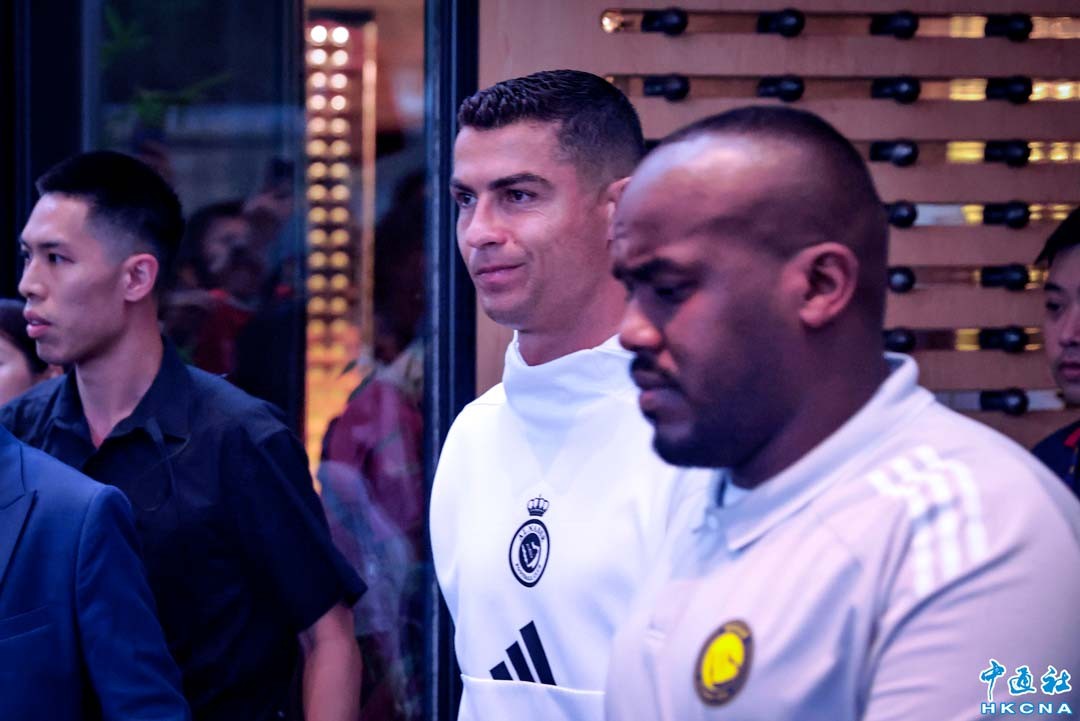8月14日,由著名球星克里斯蒂亞諾·羅納爾多領軍的利雅得勝利抵達香港,備戰沙特超級杯,大批粉絲在酒店等候,希望一睹偶像風採。“沙特超級盃2025”將於本月19日至23日在香港大球場上演。圖為C羅走出酒店。(香港中通社記者 謝光磊攝)
