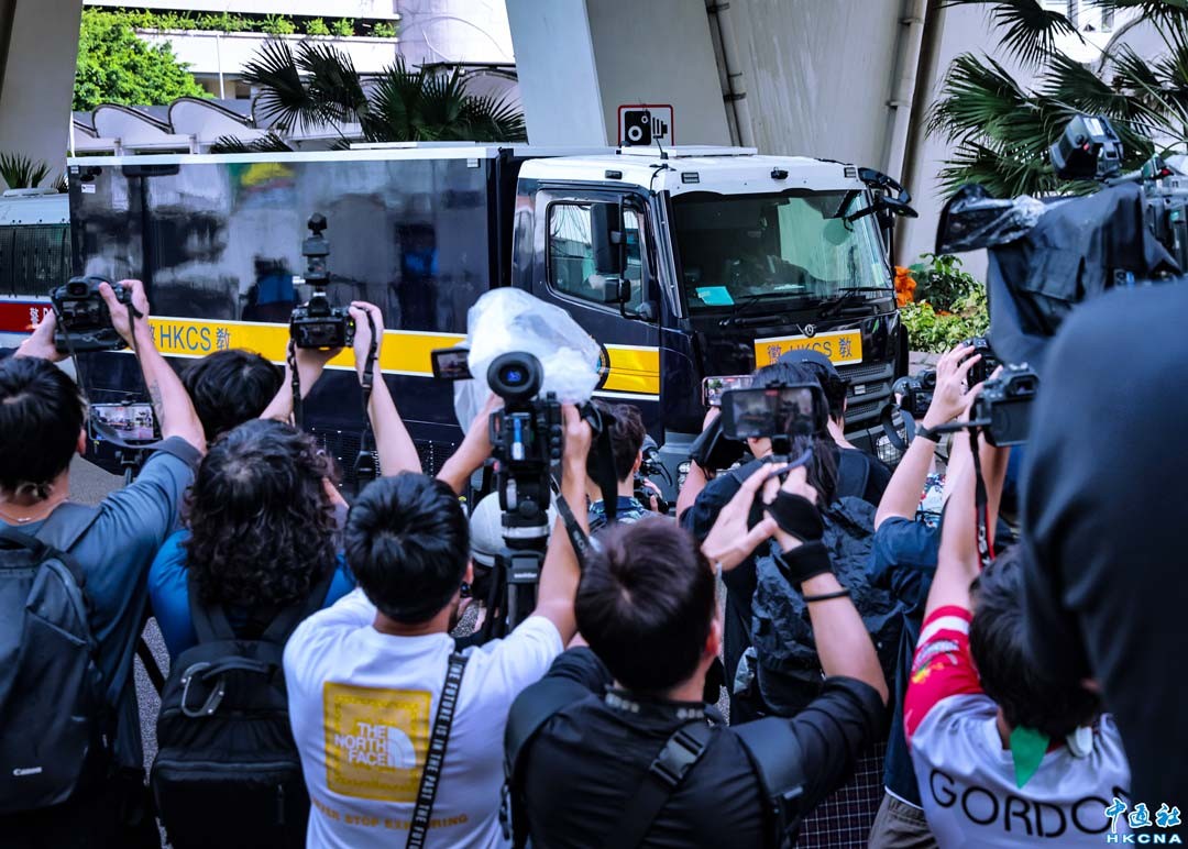 8月15日,壹傳媒創辦人黎智英涉嫌干犯香港國安法,被控一項串謀刊印複製煽動刊物罪及兩項串謀勾結外國或者境外勢力危害國家安全罪。受昨日的惡劣天氣影響,案件控辯雙方延期至今日開始進行結案陳詞。圖為大批傳媒關注黎智英由囚車押送至法院。(香港中通社記者 謝光磊攝)