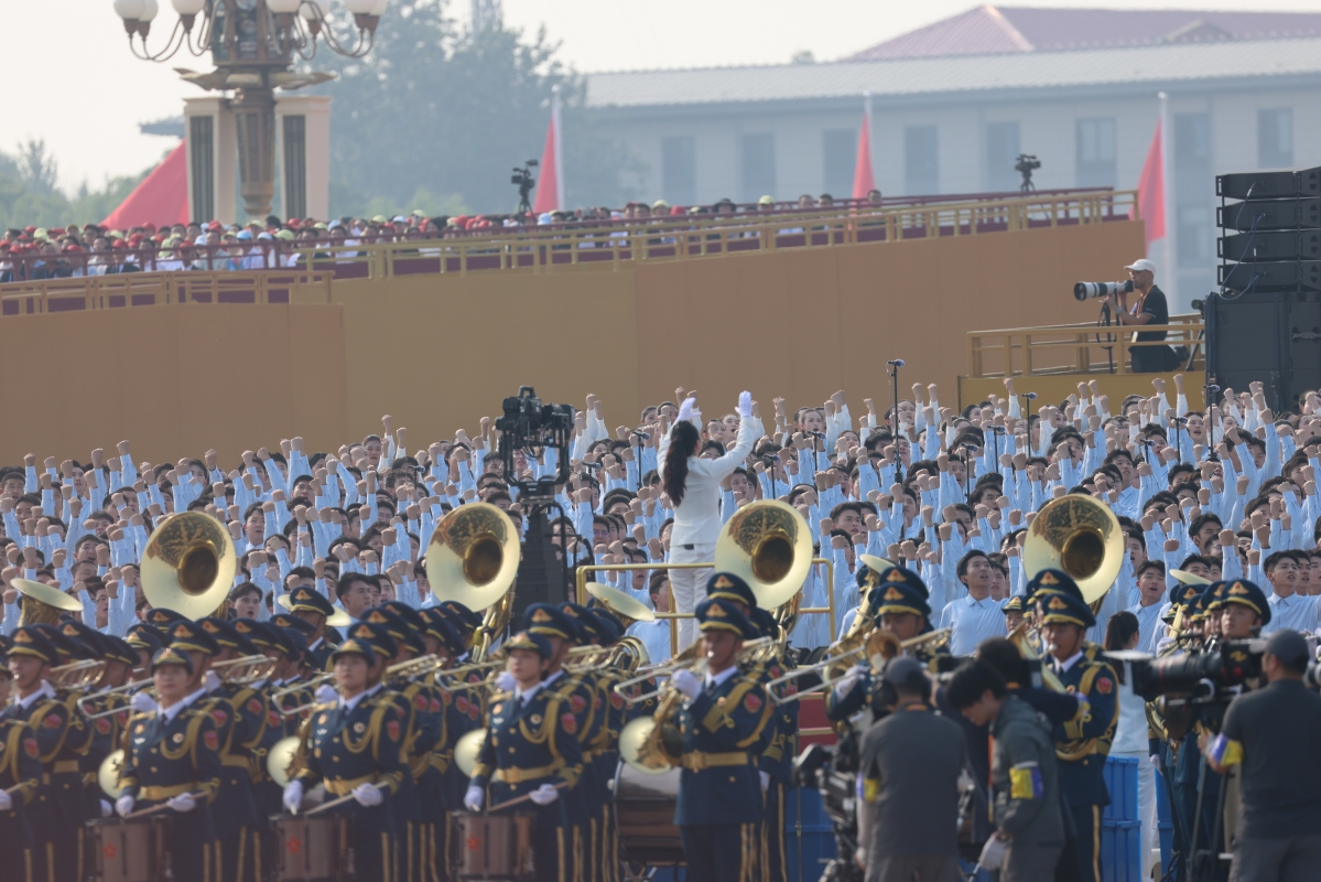 (香港中通社記者 謝光磊攝) 9月3日清晨5時30分許,紀念中國人民抗日戰爭暨世界反法西斯戰爭勝利80週年大會開始前,現場抓緊最後的時間進行綵排。