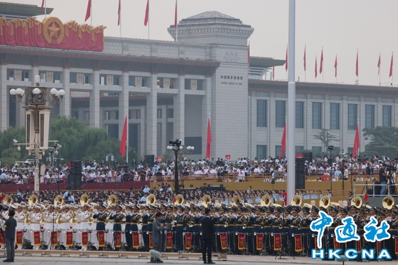 9月3日清晨,閱兵大會開始前現場進行綵排,千餘名官兵組成的新中國閱兵史上規模最大的聯合軍樂團,將在人民英雄紀念碑前,演奏大家耳熟能詳的抗戰經典曲目,和大家共同追憶那段艱苦卓絕的抗戰歲月,緬懷那些為民族獨立和自由獻出寶貴生命的英雄先烈。(香港中通社記者謝光磊攝) 香港中通社圖片 從空中視角看,天安門廣場南側的正陽門和毛主席紀念堂中間的區域,是已經準備就緒的禮炮陣地,56門禮炮以八字型排開。 今天,廣場上許多元素都體現了“80”,凸顯紀念抗戰勝利80周年的主題。