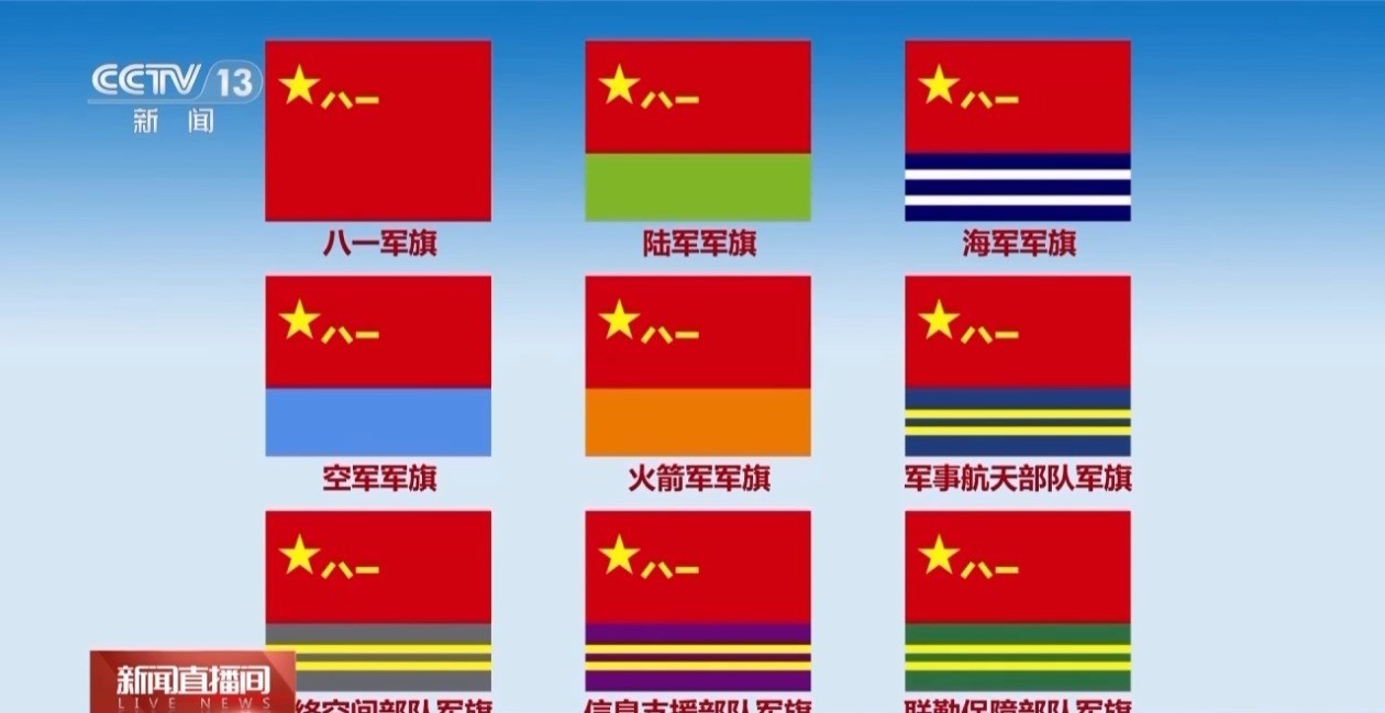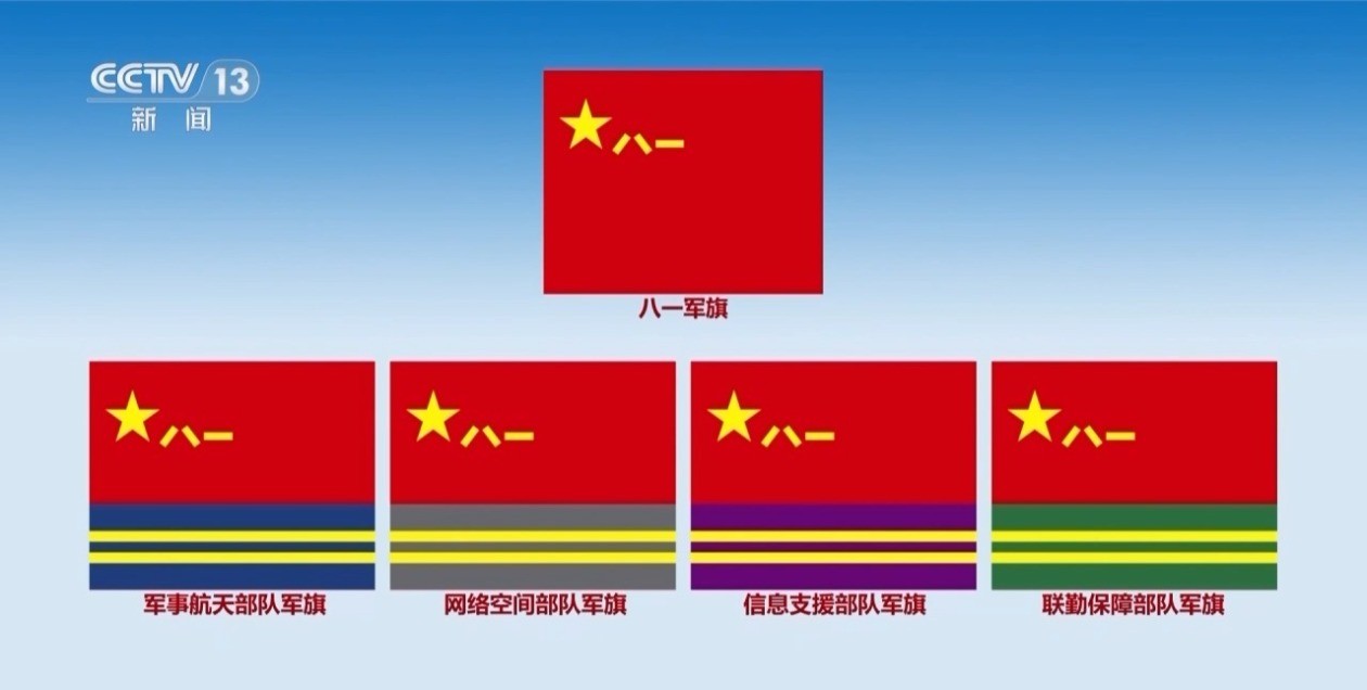 今年7月,中國人民解放軍發佈了軍事航天部隊、網絡空間部隊、信息支援部隊、聯勤保障部隊軍旗旗面式樣。本次閱兵,受閱方隊將擎各自軍旗和武警部隊旗,全方位展示解放軍軍事力量。