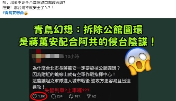 (“高雄林小姐”臉書截圖) 臉書粉絲專頁“高雄林小姐”14日亦分享親綠網友對拆除公館圓環的看法,對方宣稱“為什麼蔣萬安一定要搞掉公館圓環?因為附近的蟾蜍山就有空軍作戰指揮中心!這能讓坦克軍隊進入城市戰後,進攻方更容易且迅速進攻!”對此,“高雄林小姐”忍不住諷刺,“那要不要全台每個路口都改圓環?那台灣不就安全了?”直批這是“青鳥妄想曲”。 藍委徐巧芯直言,很多不實的謠言和中傷,對於台北市政府來說非常不公平。她亦對這種毫無根據的說法哭笑不得:“如果這樣的說法成立,全台灣是不是要新建500個圓環,以阻解放軍的登陸?看到‘綠地’高雄也準備拆掉圓環了,他們也要同樣抗議高雄拆掉圓環嗎?” 事實上,綠營這種“為反而反”的言行早已不是第一次。早前台北市計劃引入可負責繪測及巡視道路的“智能機器狗”以提升巡檢效率時,便因載具購自大陸(核心設備由台灣廠商自行研發)而被指是“拉特洛伊木馬入城”;包括此前台灣退役陸軍少將於北辰公開聲稱解放軍登陸台灣島“一定會迷路”,因為他們無法使用谷歌地圖導航,手機和GPS信號會被屏蔽等。 這些言論都讓人忍俊不禁,也看出台灣部分人士凡事政治化,將政治淩駕於一切之上的居心。若綠營的這種“被害妄想症”遲遲不好,遲早會讓其他台灣民眾真正受傷。 【編輯:紀東】