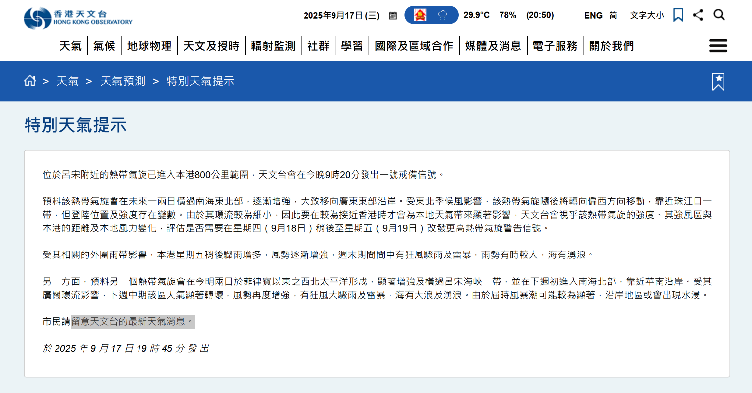 香港天文台網站截圖 預料該熱帶氣旋會在未來一兩日橫過南海東北部,逐漸增強,大致移向廣東東部沿岸。受東北季候風影響,該熱帶氣旋隨後將轉向偏西方向移動,靠近珠江口一帶,但登陸位置及強度存在變數。 由於其環流較為細小,因此要在較為接近香港時才會為本地天氣帶來顯著影響,天文台會視乎該熱帶氣旋的強度、其強風區與香港的距離及本地風力變化,評估是否需要在星期四(9月18日)稍後至星期五(9月19日)改發更高熱帶氣旋警告信號。 受其相關的外圍雨帶影響,香港星期五稍後驟雨增多,風勢逐漸增強,週末期間間中有狂風驟雨及雷暴,雨勢有時較大,海有湧浪。 另一方面,預料另一個熱帶氣旋會在今明兩日於菲律賓以東之西北太平洋形成,顯著增強及橫過呂宋海峽一帶,並在下週初進入南海北部,靠近華南沿岸。受其廣闊環流影響,下週中期該區天氣顯著轉壞,風勢再度增強,有狂風大驟雨及雷暴,海有大浪及湧浪。由於屆時風暴潮可能較為顯著,沿岸地區或會出現水浸。 香港天文台提醒市民,留意天文台的最新天氣消息。(完) 【編輯:梁嘉軒】