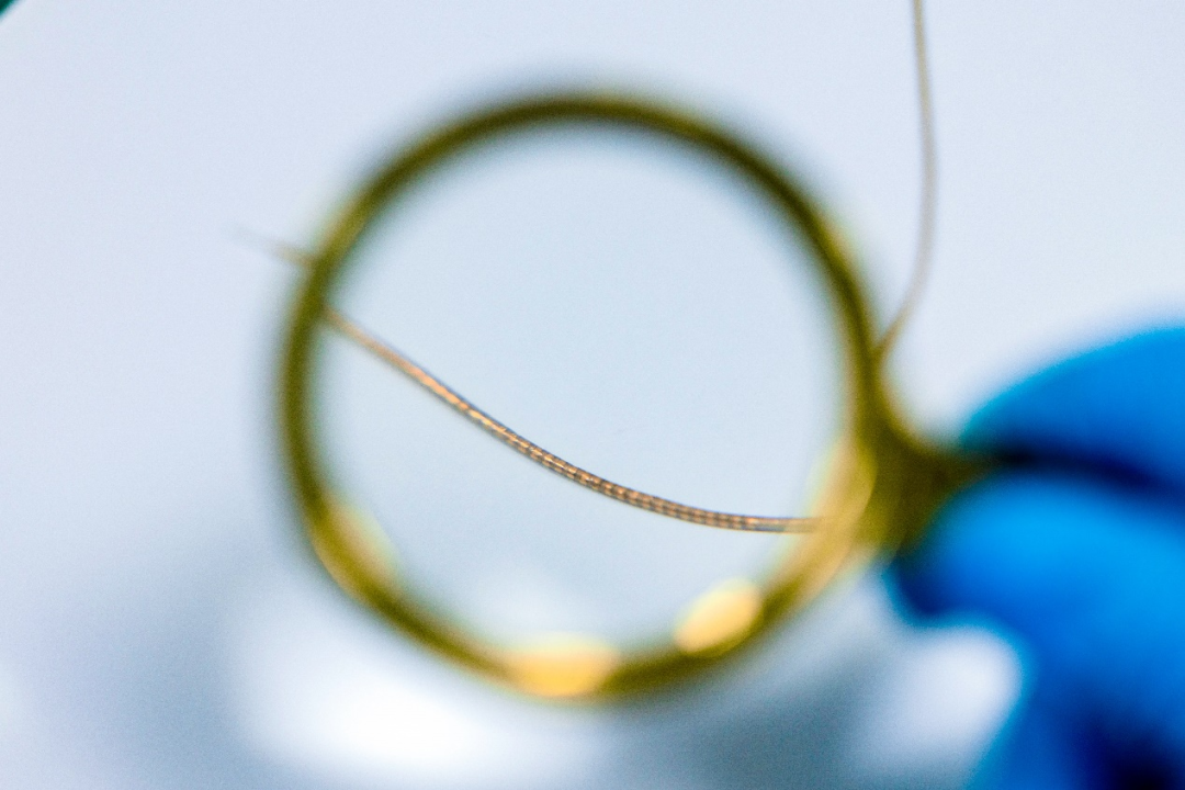放大鏡視野下的60通道神經纖維電極。這根纖細的神經纖維電極沿軸向集成了多達60個獨立的生物電信號采集通道。 據中國科學院深圳先進技術研究院宣布,他們聯合東華大學的科研團隊,歷經5年協同攻關,成功研發出了這款 “神經蠕蟲”(NeuroWorm)。據介紹,研究團隊受蚯蚓在土壤中靈活運動和分段感知能力的啟發,通過精巧的電極結構設計和捲曲技術,將製備在超薄柔性聚合物上的二維電極陣列捲曲成一根直徑僅約200微米的纖維。 “神經蠕蟲”可在外部磁場引導下在顱內靈活游走。
