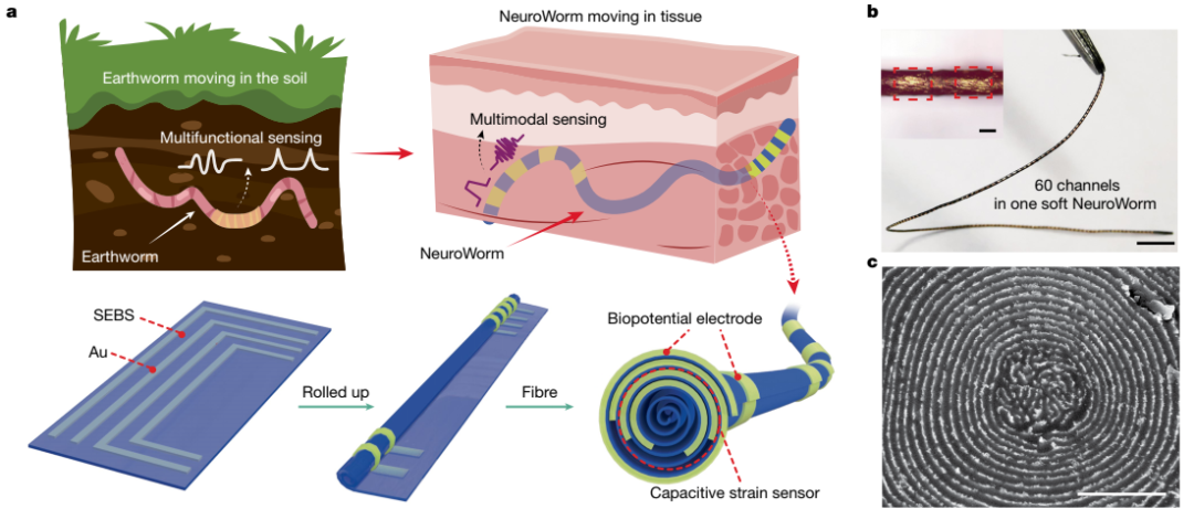 國際學術期刊《自然》17日發表了名為 “神經蠕蟲”(NeuroWorm)的新型神經纖維電極科研成果。 這款名為 “神經蠕蟲”(NeuroWorm)的新型神經纖維電極,直徑僅196微米,這根纖細的神經纖維電極沿軸向集成了多達60個獨立的生物電信號采集通道。 “神經蠕蟲”如頭髮絲般纖細、柔軟可拉伸,是可自由驅動的神經纖維電極。據快科技報道,在腦機接口等神經接口系統中,電極是連接電子設備和生物神經系統的核心界面傳感器,是腦機接口中“接口”的核心所在。然而,當前植入式電極均為“靜態”的,植入後只能固定位置、局限采集,還易因免疫反應失效,一定程度上制約了腦機接口的應用和未來發展。而“神經蠕蟲”的誕生打破了這一局限。 該研究首次提出了腦機接口“動態電極”的新範式,打破了植入式電極的“靜態”傳統,為腦機接口電極的研究與應用開闢了新方向。
