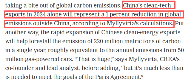 《紐約時報》網站報道截圖 根據米利維爾塔的計算,僅2024年中國出口的清潔技術就意味著一年內能阻止2.2億噸碳的排放,約相當於5000萬輛燃油車一年的排放量。文章認為,這意味著,中國清潔能源相關出口已經削弱了全球碳排放。 (完) 【編輯:紀東】