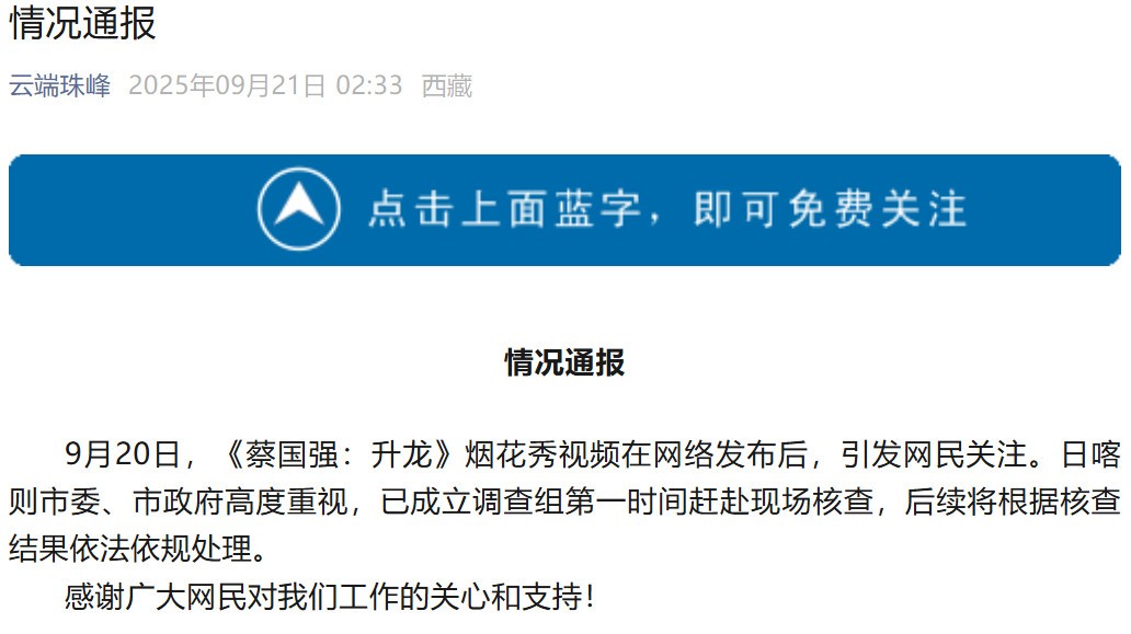 香港新聞網9月21日電 9月21日凌晨,中國西藏自治區日喀則市政府官方微信公眾號“雲端珠峰”發佈情況通報:9月20日,《蔡國強:升龍》煙花秀視頻在網絡發佈後,引髮網民關注。日喀則市委、市政府高度重視,已成立調查組第一時間趕赴現場核查,後續將根據核查結果依法依規處理。