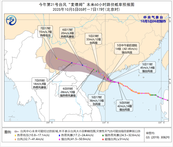 颱風“麥德姆”靠近中國內地城市。圖源:中央氣象台。 預計,“麥德姆”將以每小時20~25公里的速度向西偏北方向移動,強度還將有所加強,并將於今天(5日)中午前後在廣東吳川至海南文昌一帶沿海登陸 (強颱風級,14級,42~45米/秒),登陸後強度逐漸減弱。 10月5日8時至6日8時,南海西北部和中西部海域、東沙群島、西沙群島、北部灣、瓊州海峽、廣西南部及沿海、廣東南部及沿海、海南島及沿海將有6~8級、陣風9~10級的大風,其中,南海西北部海域、瓊州海峽、北部灣北部海域、廣東雷州半島及沿海、廣西沿海、海南島東部和北部沿海的風力有9~11級、陣風12~13級,部分海域或地區風力可達12~14級,陣風15~16級。