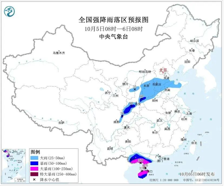 未來兩天內地多個城市或迎來大暴雨或特大暴雨。圖源:中央氣象台。 10月5日8時至6日8時,海南島大部、廣東西南部、廣西南部等地部分地區有暴雨到大暴雨,局地特大暴雨(250~320毫米)。 中央氣象台10月5日06時發佈暴雨橙色預警:預計,10月5日08時至6日08時, 海南島大部、廣東西南部、廣西南部等地部分地區有暴雨到大暴雨,局地特大暴雨(250~320毫米) 。 此外,四川盆地、陝西中部和南部、山西中南部、河北南部、山東北部、河南北部等地的部分地區有大雨。 廣東、澳門多地受影響停運、停航 受颱風“麥德姆” 影響,澳門特區政府地球物理氣象局今天(10月5日)凌晨2時發出八號風球。 根據預測,“麥德姆”將在今天凌晨至早上最接近澳門,在澳門以南約300公里掠過,并有機會增強至強颱風級別。