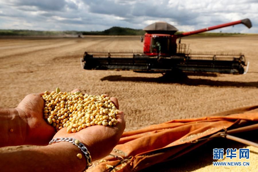 資料圖:收割機在巴西首都巴西利亞郊區的農田裡收割大豆。新華社發(盧西奧·塔沃拉攝)