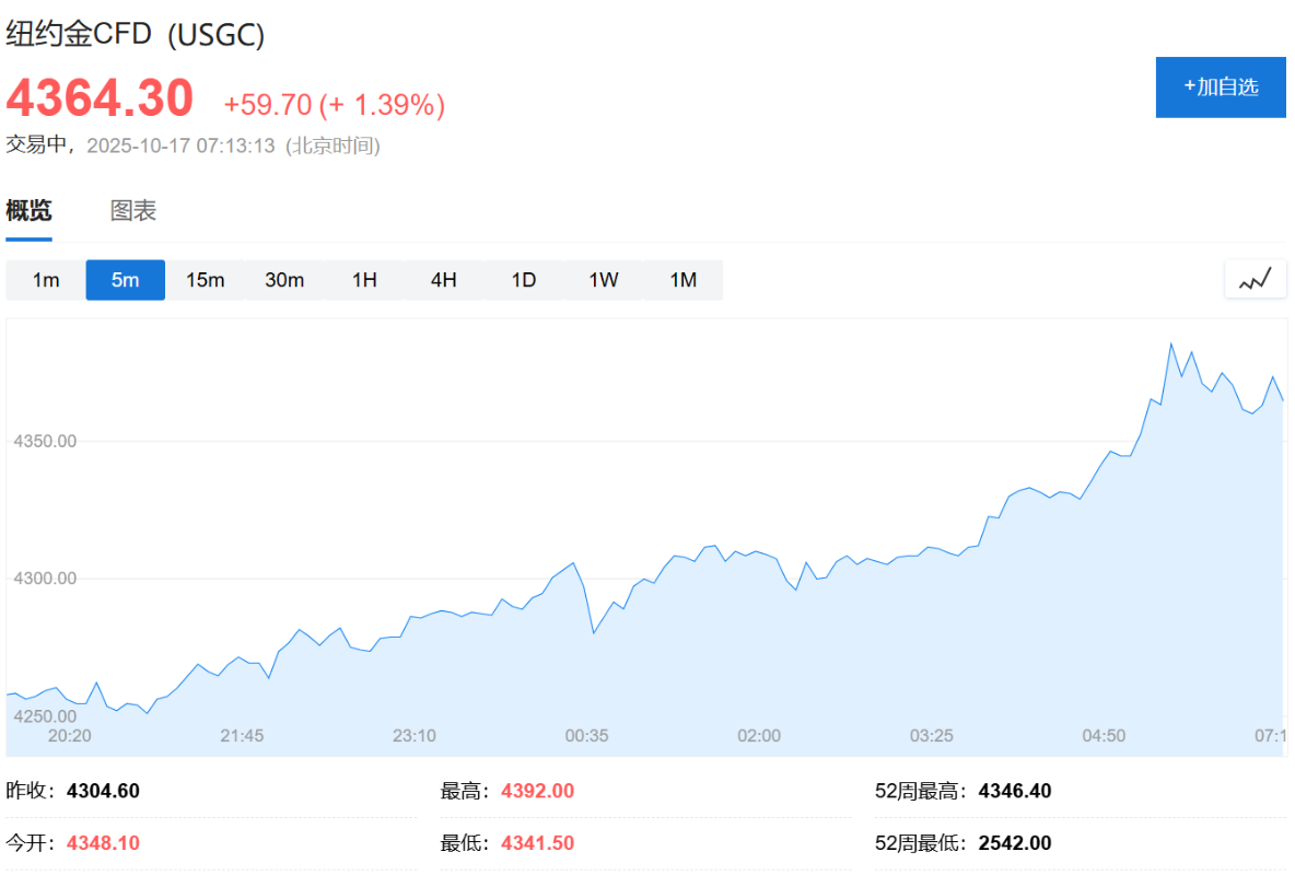 香港新聞網10月17日電 美東時間10月16日,黃金連續第四個交易日創美股盤中新高,盤中首次突破4300美元大關。當日,COMEX黃金期貨收漲3.4%,報4344.3美元/盎司,刷新收盤新高。
