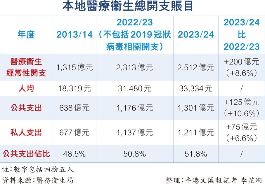 香港醫療經常開支逾2512億 逾半用於公共醫療系統香港新聞網10月17日電 在香港人口老齡化情況下,公共醫療開支顯著增加。香港特區政府醫務衞生局10月16日發表2023/24年度《本地醫療衞生總開支賬目》,該年度醫療衞生經常性開支高達2,512.07億元,較上一個年度(不包括2019冠狀病毒病相關開支)增加約200億元,昇幅8.6%,近52%用於公共醫療系統,十年間升一倍;人均醫療衞生經常性開支為33,334元。隨著長者人口由164萬增至2036年的244萬,令醫療體系面對嚴峻挑戰,公營醫療收費改革迫在眉睫,對於2026年起公立醫院上調藥物收費及急症室等費用,醫衞局強調調整收費對增加收入作用不大,但額外收入會全數投入公營醫療系統中。