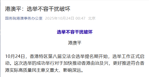港澳平:選舉不容干擾破壞香港新聞網10月24日電 國務院港澳辦微信公眾號10月24日發表題為《选举不容干扰破坏》的評論文章,全文如下: 10月24日,香港特區第八屆立法會選舉提名期開始,選舉工作正式啟動。這次選舉的成功舉行對於加快推動香港由治及興,更好推進符合香港實際高質量民主意義重大、影響深遠。