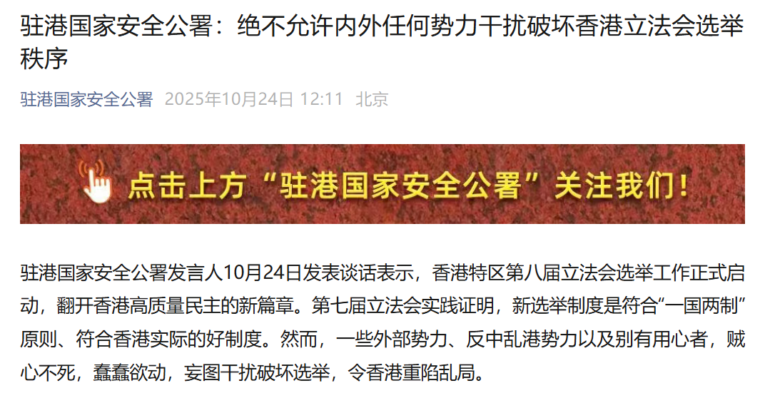 香港新聞網10月24日電 駐港國家安全公署發言人10月24日發表談話表示,香港特區第八屆立法會選舉工作正式啟動,翻開香港高質量民主的新篇章。第七屆立法會實踐證明,新選舉制度是符合“一國兩制”原則、符合香港實際的好制度。然而,一些外部勢力、反中亂港勢力以及別有用心者,賊心不死,蠢蠢欲動,妄圖干擾破壞選舉,令香港重陷亂局。