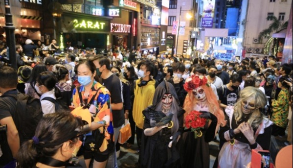 香港中通社10月31日電 10月31日晚是萬聖夜,香港不少市民遊客穿上奇裝異服,到中環蘭桂坊過節,現場人潮湧湧。
