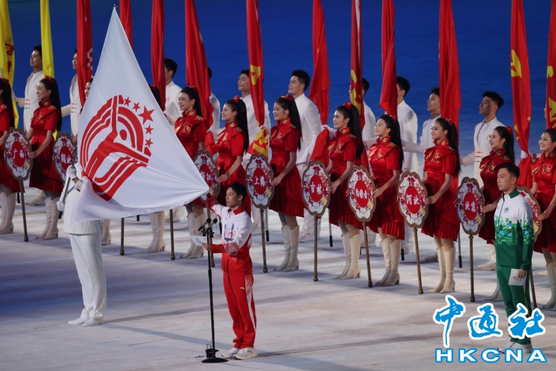 11月9日,中華人民共和國第十五屆運動會開幕式在廣東奧林匹克體育中心舉行。以“圓夢未來”為主題的開幕式包括“同根同源、同心同緣、同夢同圓”三個篇章,展現粵港澳大灣區的壯闊圖景。圖為體育代表團旗幟入場。(香港中通社記者 謝光磊 攝) 香港中通社圖片