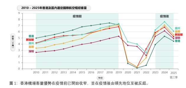 報告指出,與新加坡、首爾、廣州及深圳等區內航空樞紐相比,香港機場的客量優勢早在疫情前已開始收窄,並在疫情後遭到反超(圖 1)。因此“按兵不動”,寄望單靠三跑道系統(三跑)帶來的跑道容量維持優勢並不可取。在廣深第二高鐵落成後,三跑或無法充分發揮其運力潛力,難以說服公眾此重大投資物盡其用,削弱香港在區域格局中的地位。