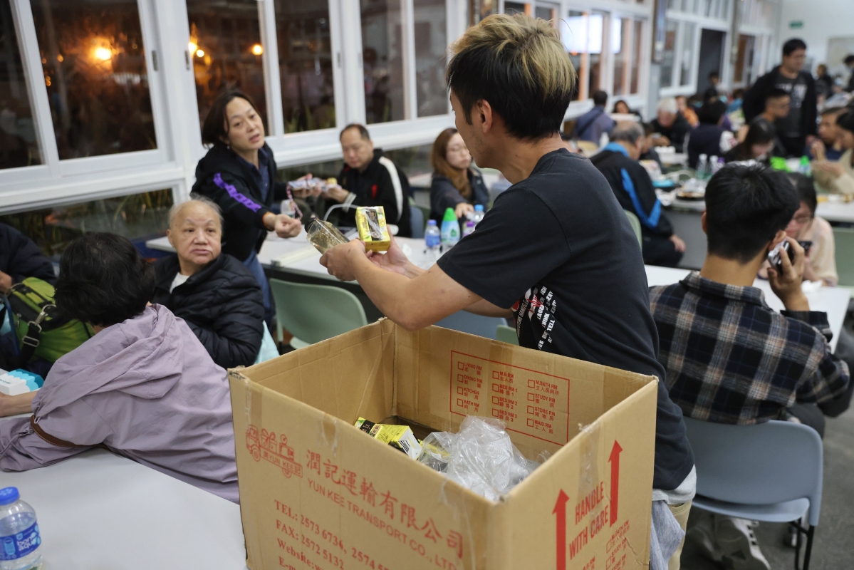 臨時庇護中心向受火警影響的居民發放食物、水、棉被等物資。