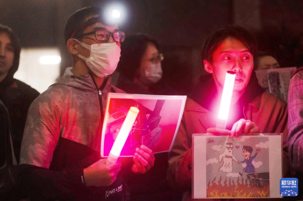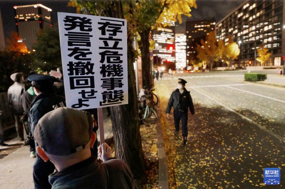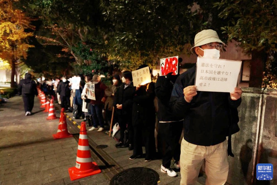 日本民眾星期五(11月28日)晚在位於東京的首相官邸前再度舉行抗議集會,要求高市早苗撤回相關言論。新華社記者 賈浩成 攝 據新華社28日報道,這是繼11月21日和25日的抗議活動後,在日本首相官邸前舉行的又一次抗議集會,有數百人參加。抗議者手持寫有“高市辭職”“不能忘記歷史,不能重蹈覆轍”等字樣的牌子,要求高市早苗撤回涉台言論。 抗議者友子對記者說:“目前中日關係降溫,不管怎麼看都是高市早苗的問題,也就是她的那番言論引起的。” 抗議者阪卷對記者說,中日關係正在不斷惡化,為防止事態繼續朝不好的方向發展,高市早苗應當撤回其錯誤言論。 抗議者遼在現場手舉一幅漫畫,畫面中高市早苗與一個“軍國主義幽靈”握手。他表示,很擔心日本走向軍國主義化。