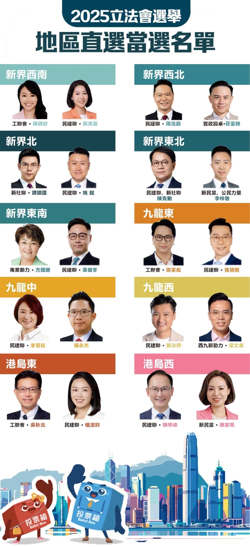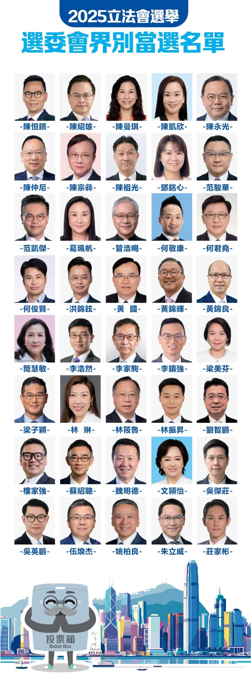 製圖:香港新聞網 蘇淳淳 地區直選20人當選名單: 香港島東:吳秋北、植潔鈴 香港島西:陳學鋒、陳家珮 九龍東:鄧家彪、張培剛 九龍西:梁文廣、鄭泳舜 九龍中:李慧琼、楊永杰 新界東南:方國珊、葉傲冬 新界北:譚鎮國、姚銘 新界西北:周浩鼎、莊豪鋒 新界西南:陳穎欣、郭芙蓉 新界東北:陳克勤、李梓敬 功能界別30人當選名單: 鄉議局:劉業強 漁農界:陳博智 保險界:陳沛良 航運交通界:林銘鋒 教育界:鄧飛 法律界:陳曉峰 會計界:吳錦華 醫療衞生界:林哲玄 工程界:卜國明 建築、測量、都市規劃及園境界:劉文君 勞工界:周小松、李廣宇、林偉江 社會福利界:陳文宜 地產及建造界:黃浩明 旅遊界:江旻憓 商界(第一):林偉全 商界(第二):姚祖輝 商界(第三):嚴剛 工業界(第一):黃永威 工業界(第二):吳永嘉 金融界:陳振英 金融服務界:李惟宏 體育、演藝、文化及出版界:霍啟剛 進出口界:鍾奇峰 紡織及製衣界:陳祖恒 批發及零售界:邵家輝 科技創新界:邱達根 飲食界:梁進 人大政協界:陳勇 選委會界別40人當選名單: 姚柏良、李家駒、文頴怡、吳傑莊、伍煥杰、劉智鵬、鄧銘心、樓家強、范凱傑、蘇紹聰、洪錦鉉、何俊賢、管浩鳴、吳英鵬、黃錦輝、陳永光、李鎮強、何君堯、林筱魯、陳恒鑌、何敬康、魏明德、范駿華、陳宗彝、陳凱欣、梁子穎、葛珮帆、朱立威、陳紹雄、林琳、莊家彬、李浩然、林振昇、黃國、黃錦良、簡慧敏、梁美芬、陳曼琪、陳祖光、陳仲尼 【編輯:紀東】