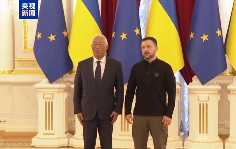 2025年10月23日,烏克蘭總統澤連斯基(右二)和歐洲理事會主席科斯塔(右一)抵達布魯塞爾,出席歐洲理事會會議。央視新聞資料圖