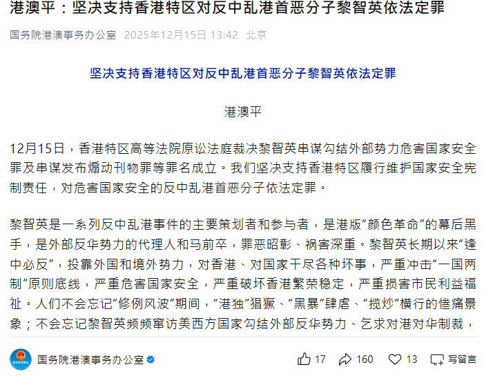 香港新聞網12月15日電 國務院港澳事務辦公室15日發表題為《堅決支持香港特區對反中亂港首惡分子黎智英依法定罪》的評論文章,全文如下: