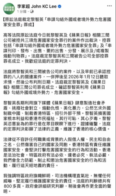 香港中通社12月15日電 壹傳媒集團創辦人黎智英及《蘋果日報》相關3間公司被控違反香港國安法案件15日裁決,香港高等法院原訟法庭裁定黎智英及3間公司全部控罪罪名成立。全國政協常委、中國和平統一促進會香港總會會長姚志勝表示,特區政府依法檢控,法庭審訊過程公開、公平、公正,嚴格依照法律及證據作出裁決,是捍衛國家安全、維護香港法治和社會秩序的正義之舉。香港統促總會並強烈譴責民進黨當局對黎智英案妄加置喙。 姚志勝表示,黎智英長期利用其控制的《蘋果日報》等媒體,以新聞自由為幌子,策劃煽動“黑暴”、“佔中”等一系列違法亂港事件,更與外力勾連,乞求外國制裁,公然挑戰“一國兩制”底線,嚴重危害國家安全,犯罪證據確鑿。黎智英三罪全部罪成,不僅有效震懾了內外反中亂港勢力,更堅定了香港維護國家安全的決心,也讓市民深切感受到香港完善維護國安法制帶來的安全感和穩定性。