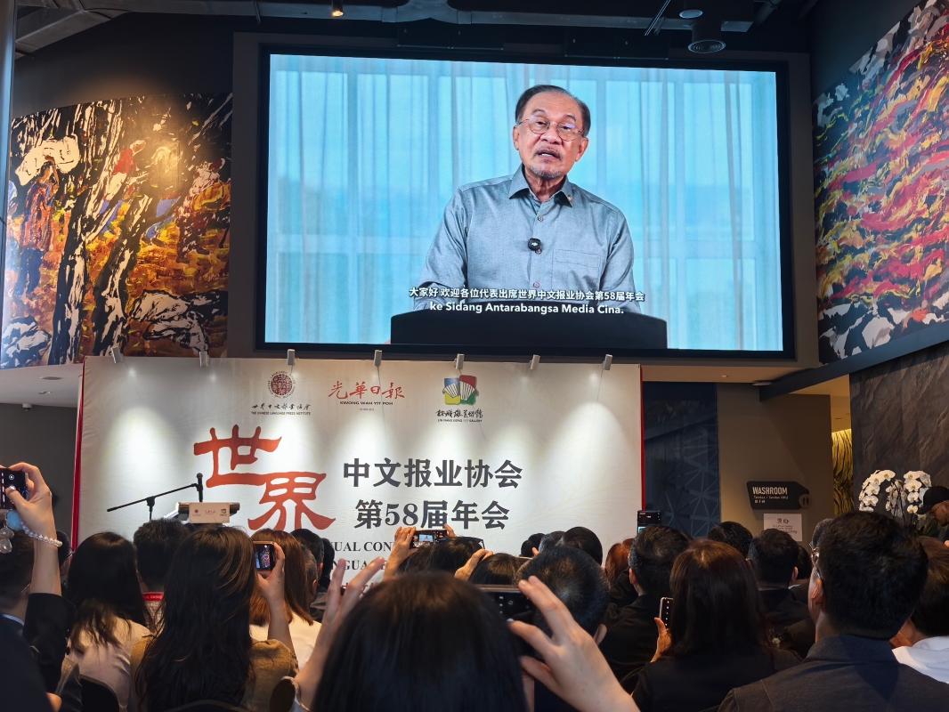 圖為馬來西亞總理安瓦爾在開幕式上通過視頻致辭。(香港中通社記者 紀東 攝) 香港中通社圖片 馬來西亞總理安瓦爾在開幕式上通過視頻致辭時表示,世界中文報業協會自1968年成立以來,始終致力於捍衛新聞自由、提升專業水準,並促進全球華文媒體之間的交流與合作。在大數據、生成式人工智慧與無國界傳播的時代,世界更需要負責任的新聞報道,更能提升人類共同價值的敘事方式,以及對真相、公平與尊嚴更深層次的承諾。 會議期間,多位嘉賓發表與AI技術相關的主題演講。馬來西亞國家新聞社主席拿督斯里黃振威圍繞“利用AI驅動媒體公司增效降本”展開分享;北京大學藝術學院客座教授林祥雄發表“淺談華文報業與南洋地域的華族社群”演講;中信金融管理學院科技金融研究所教授、AI人工智能金融研究中心執行長孫大千教授以“在AI時代重塑中文媒體的全球角色”為題闡述觀點等。