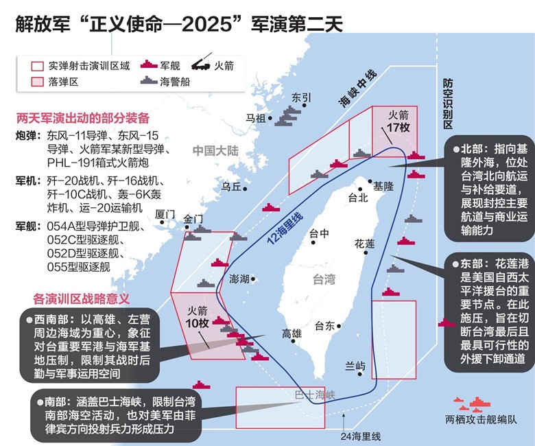 中國人民解放軍東部戰區12月30日發佈的一段視頻畫面顯示,解放軍地面部隊的軍事裝備對台灣南部水域進行遠程實彈演習。央視新聞圖 台灣資深軍事評論員亓樂義指出,PHL-191量大、成本低,若多波次運用,數量龐大且防禦困難,對台灣構成長期挑戰。他認為,火箭彈落點集中在台灣北部的基隆外海,意在阻斷台灣對外生命線,若呈現規律分布,顯示具備精準打擊能力。 亓樂義進一步分析,解放軍此次劃設五個演訓區,意在驗證對台封控、對外拒止能力:北部鎖定基隆外海,西南部壓制高雄、左營軍港;巴士海峽兼顧封控南部并拒止美軍自菲律賓投射;東部則以花蓮為重點,阻斷外援下卸通道。 這次五個演訓區均將台灣12海里“領海”、“領空”劃設在內。亓樂義研判,中國大陸有意逐步將演訓推進至12海里常態化,除政治意涵外,也有搜集台灣接近戰爭狀態反應的情報價值。 在中日關係緊張與美國對台軍售背景下,國際輿論普遍認為,這次軍演被視為中國對美日釋放政治與軍事信號。 中共中央政治局委員、外交部長王毅星期二(12月30日)在北京出席2025年國際形勢與中國外交研討會時明確提到,針對台獨勢力不斷挑釁以及美國大規模對台軍售,“我們當然要堅決反對、有力反制”。 中國人民大學國際事務研究所所長王義桅在接受新加坡《聯合早報》採訪時指出,此次軍演旨在展示削弱美國與盟友介入台海的能力,“在你干涉之前,我就已經把問題解決掉了”。 據悉,這也是自2022年8月時任美國眾議院議長佩洛西訪台後,解放軍再度展開圍台實彈行動,但美方與日本反應相對低調。 美國總統特朗普僅表示已注意相關情況,但自己并不擔心,并稱中國多年來在該區域進行軍演,外界現在只是“看法不同”。 王義桅則認為,“台灣有事就是美國有事”的聯動認知,使特朗普即便表面低調,也不可能放棄台灣。但特朗普仍以“美洲優先”為核心,隨著中國春節、全國“兩會”以及特朗普訪華時程推進,當前台海緊張或僅屬階段性升溫。(完) 【編輯:豐悅】