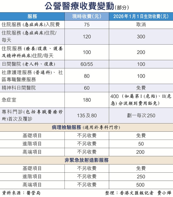 香港文匯報製圖 香港醫管局於明起(2026年1月1日)全面推行公營醫療收費改革的各項措施,其中急症室收費會由現時劃一收180元改為兩級制,除了危殆或危急病人可獲豁免繳費外,其餘類別的病人,收費一律加至400元,與私家診所收費相若;另外住院服務、專科門診、病理檢驗服務等收費亦有調整(見上表)。 香港西醫工會會長陸偉亮在接受香港文匯報訪問時表示,雖然暫未收到該會家庭醫生會員表明有意跟隨公院加價,但相信私家醫院或會酌量調整,“醫管局實施新收費後,若私家醫院與公立醫院收費只有約三成差距,相信部分病人寧願到私家醫院門診看症,私家醫院或因此調整收費,但估計私院亦不會出現人手緊張情況。” 他指出香港特區政府一直提倡“一人一家庭醫生”概念,家庭醫生是主要基層醫療服務提供者,市民可藉收費改革更多選擇向家庭醫生求診。