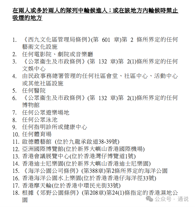 (《志明與春嬌》電影截圖) 但這樣的景象現在越來越少了,特別是在今年的1月1日之後,因為2026年香港加速城市“無煙化”進程,新一階段控煙措施1月1日起正式實施。 三大措施控煙 這次的控煙措施在以往的基礎上新增了三項規定:擴大法定禁煙區、排隊時禁止吸煙、及吸煙罪行罰款升至3000港元。 禁煙區從以往的電梯、公共交通工具等封閉空間,電影院、體育場、商場、食肆等室內公共場所,擴大到涵蓋幼兒中心、院舍、學校、醫院、指明診所及健康中心專用出入口外3米範圍內的公眾地方,進一步保護兒童、長者、院友和病人等群體免受二手煙的危害。