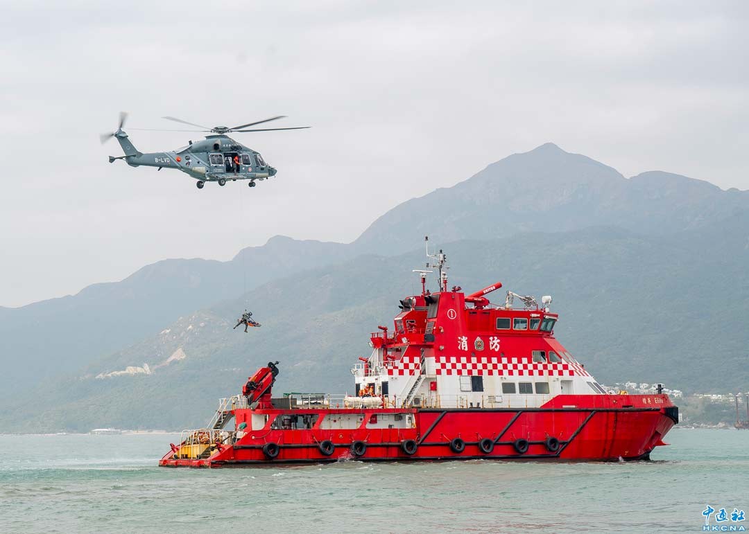 1月12日,香港民航處在大嶼山望東灣附近海域舉行應急搜索及救援演練,聯同飛行服務隊、警務處、消防處等多個政府部門,以及解放軍駐港部隊參與,測試跨部門協作及海空搜救能力。圖為飛行服務隊直升機從消防船轉送生還者前往醫院。(香港中通社記者 陳奕啟 攝)