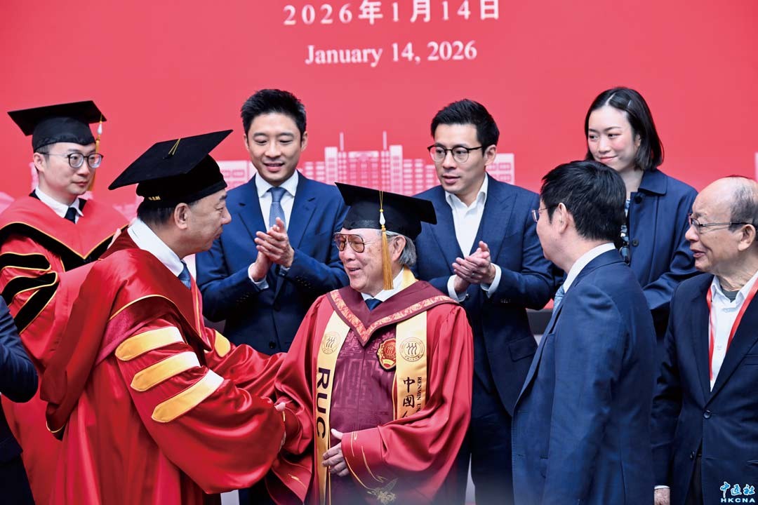 1月14日,在中國人民大學深圳研究院前海院區,中國香港體育協會暨奧林匹克委員會會長、國際奧委會名譽委員、霍英東集團主席霍震霆先生獲授中國人民大學法學名譽博士學位。(陳文 攝)