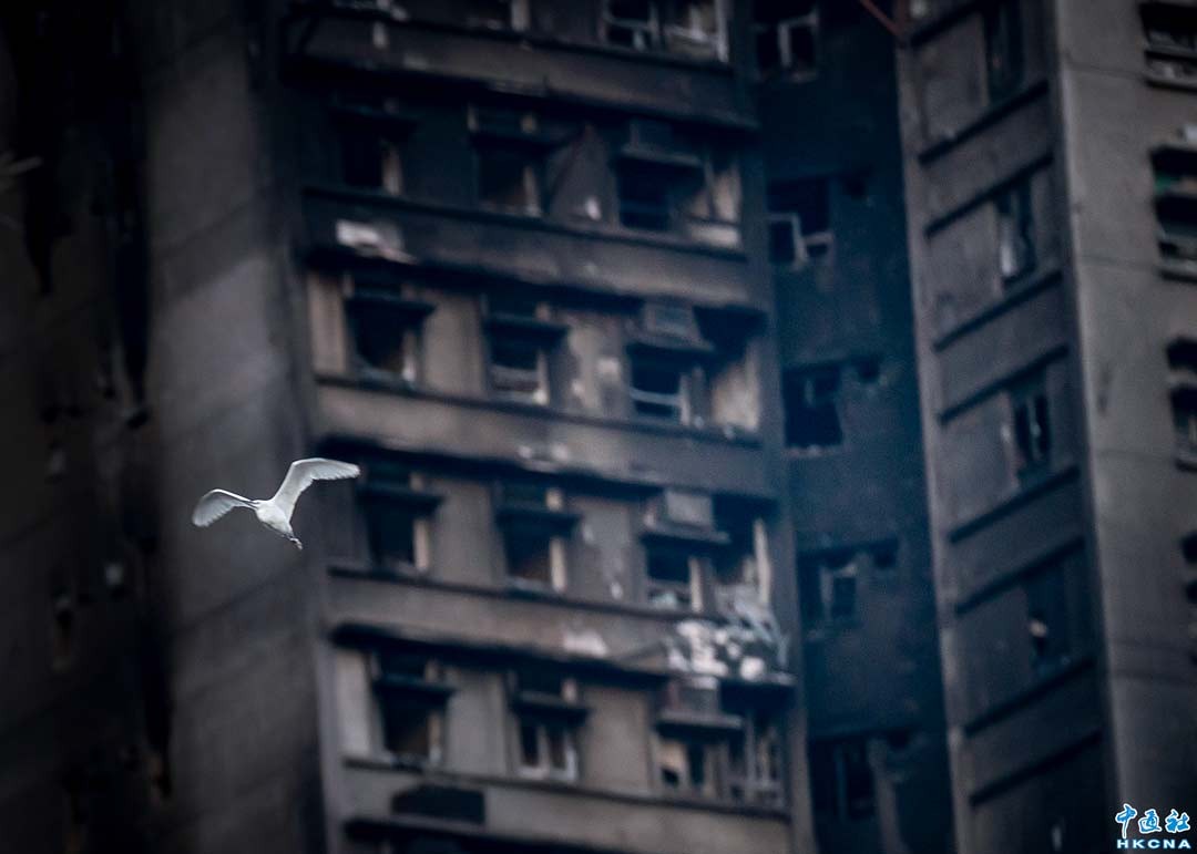 1月14日,香港第八屆立法會首次會議舉行,議程聚焦大埔宏福苑災後支援及重建工作。圖為災後的大埔宏福苑。(香港中通社記者 陳奕啟 攝)