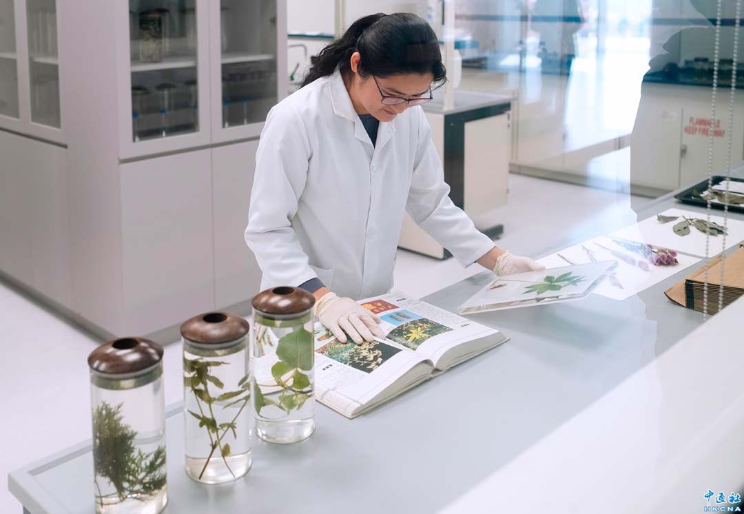 1月15日,香港政府中藥檢測中心永久大樓已分階段投入服務,大樓設有7間中藥標本館,展出約3,500份標本。大樓同時配備標本實驗室及“神農本草園”,供科研及公眾參觀之用。圖為標本館展出的中藥標本。圖為工作人員在製作中藥材標本。(香港中通社記者 陳奕啟 攝)