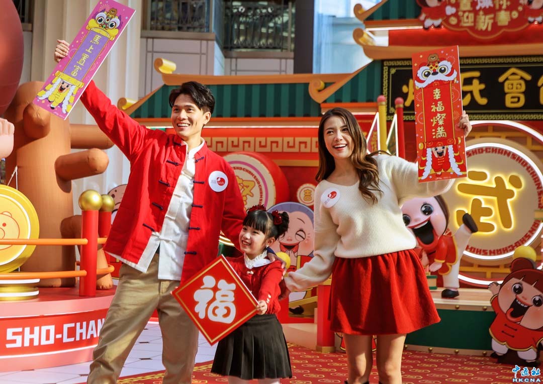 香港馬鞍山廣場以“燦氏會館賀新歲”為主題的新春裝飾近日靚麗登場,結合日本插畫師Akirambow創作的SHO-CHAN角色,打造春節造型主題展區。現場設有近4米高吹氣公仔、傳統木人樁及賀年燈籠,吸引市民駐足拍照。(香港中通社記者 鄧梓傑 攝)