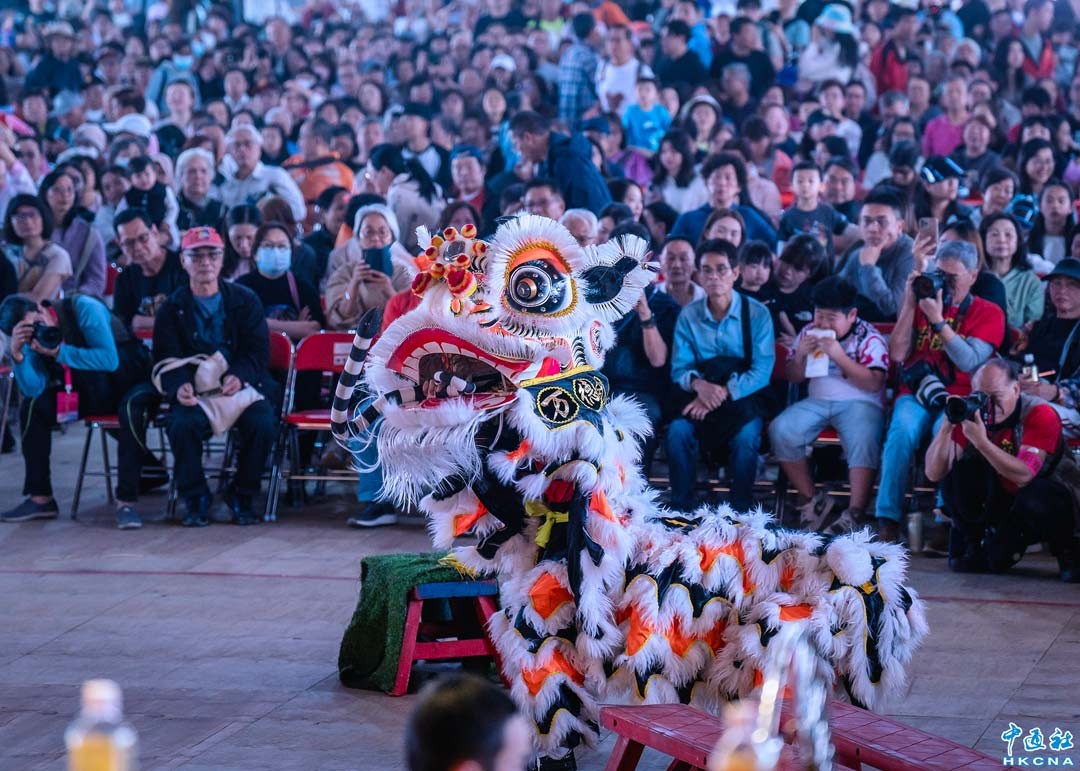 1月17日,香港錦田鄉獅王爭霸賽於錦田鄉酬恩建醮大戲棚上演,28隊來自粵港澳三地的頂尖龍獅隊齊聚現場,以高樁採青、靈活套路競逐“錦田獅王”殊榮。(香港中通社記者 陳奕啟 攝 )