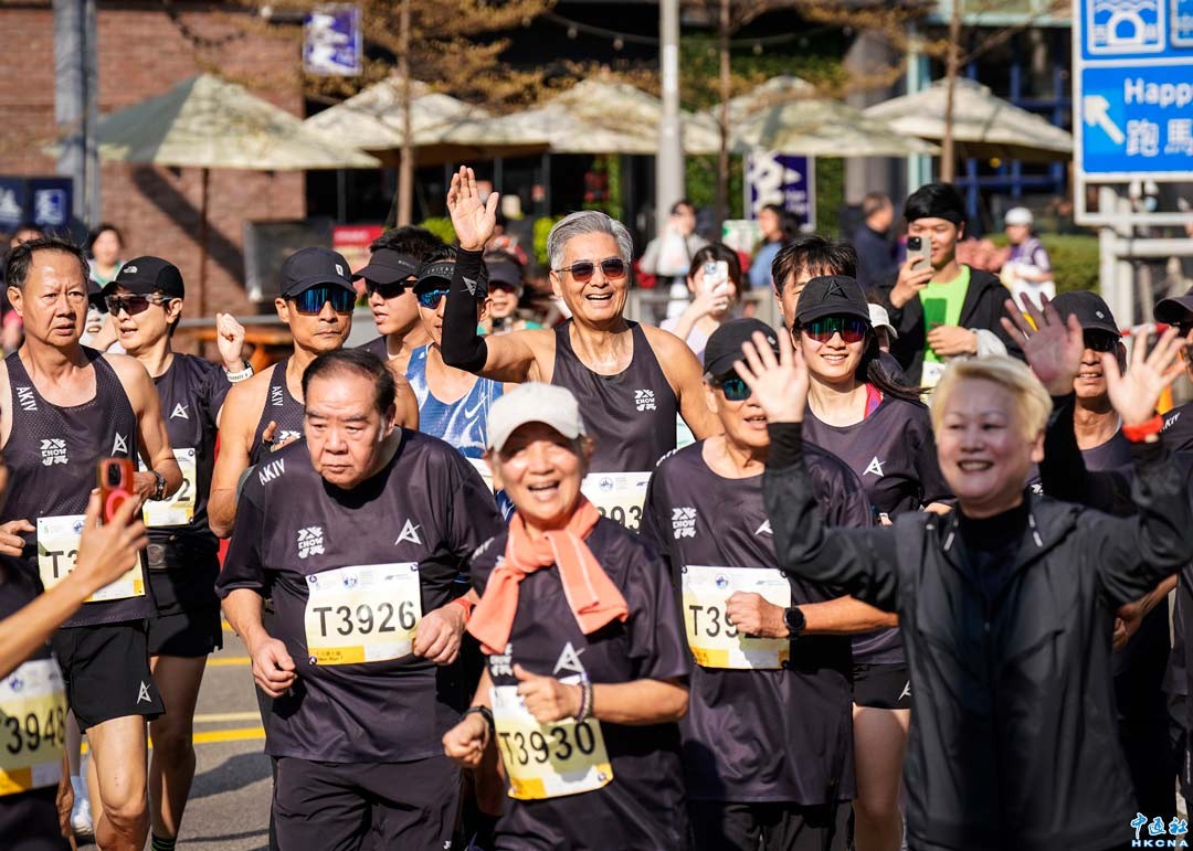香港渣打馬拉松2026在1月18日舉行,一頭濃密銀髮的影星周潤發今年回歸10公里賽事,在跑道上邊跑邊與觀眾揮手。(香港中通社記者 陳奕啟 攝)