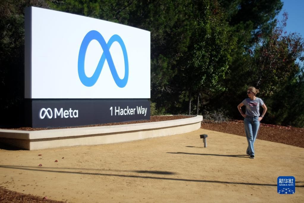圖為在美國舊金山灣區,一名女子站在“元”標誌牌前。新華社資料圖