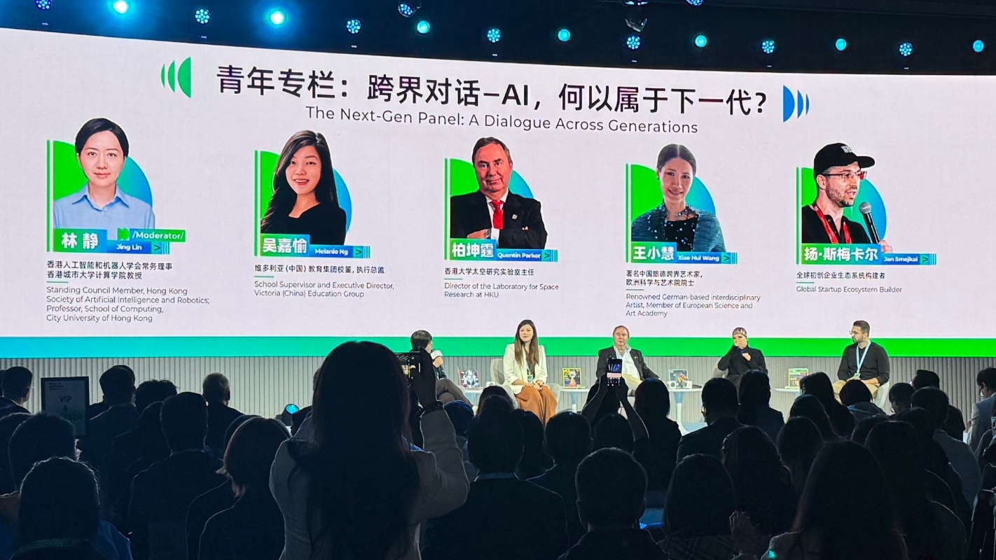 香港人工智能和機器人學會常務理事兼城市大學教授林靜(左一)、維多利亞(中國)教育集團校董兼執行總監吳嘉愉(左二)等專家出席2026 WAIC UP!年終盛會。香港新聞網記者 梁嘉軒攝 她認為,老師和家長的作用在於陪伴和引導,讓AI成為“良好工具”,幫助自己深度思考;如今家長和老師對AI的態度都非常積極,很願意擁抱改變。被問及如何防止學生過度依賴AI,如拍照搜題,吳嘉愉指出,首先這取決於老師的評估方式:若評估重點不是答案本身,而是思考過程,可以讓學生學習AI的解題思路,“我覺得就沒太多需要防止的”。(完) 【編輯:梁嘉軒】