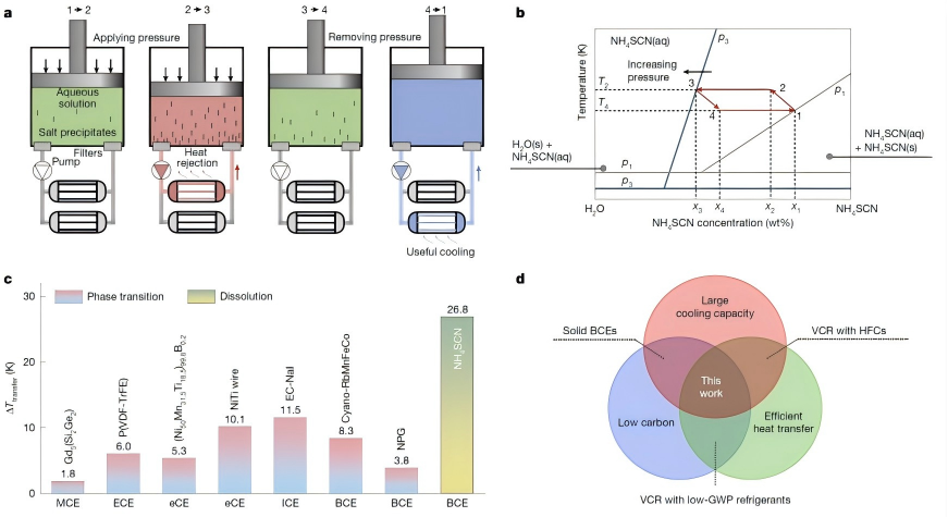 圖 : 溶解壓卡效應的原理與特點。a. 製冷循環示意圖;b. 溶液溫度-濃度相圖以及對應於圖a的循環過程;c. 不同材料的換熱流體溫降數據對比;d. 溶解壓卡效應與固體壓卡效應及氣體壓縮製冷技術的優勢對比。圖源:中國科學院金屬研究所 中國科學院金屬研究所22日介紹,近年來,基於固體相變的製冷技術因無氣體排放而受到廣泛關注。2019年,塑晶龐壓卡效應的發現,為低碳大冷量固態製冷技術提供全新的解決方案。然而固態相變製冷技術仍然存在一個突出的內禀難題:與氣體壓縮製冷技術中氣體工質的傳質傳熱不同,固體只能通過熱傳導傳熱,固體製冷工質與換熱器之間必須採用流體來間接換熱,界面熱阻的存在使得系統製冷效率與大功率應用受限。因此,能否同時實現低碳、大冷量與高換熱效率,成為製冷領域的關鍵問題。 中國科學院金屬研究所李昺研究員團隊與合作者在實驗中發現,硫氰酸銨溶液在壓力變化下表現出驚人的熱效應:加壓時鹽析出並放熱,卸壓後鹽迅速溶解並強力吸熱,室溫下溶液溫度可在20秒內驟降近30攝氏度,在高溫環境下降溫幅度更高,遠超已知固態相變製冷材料性能。這一現象被命名為“溶解壓卡效應”。 基於“溶解壓卡效應”,團隊設計出一套四步循環系統:加壓升溫→向環境散熱→卸壓降溫→輸送冷量,單次循環可實現每克溶液吸收67焦耳熱量,理論效率高達77%,展現出優異的工程應用潛力。 該成果為下一代數據中心冷卻技術提供了原創性方法,有望推動算力基礎設施低碳運行。(完) 【編輯:彭玉婷】