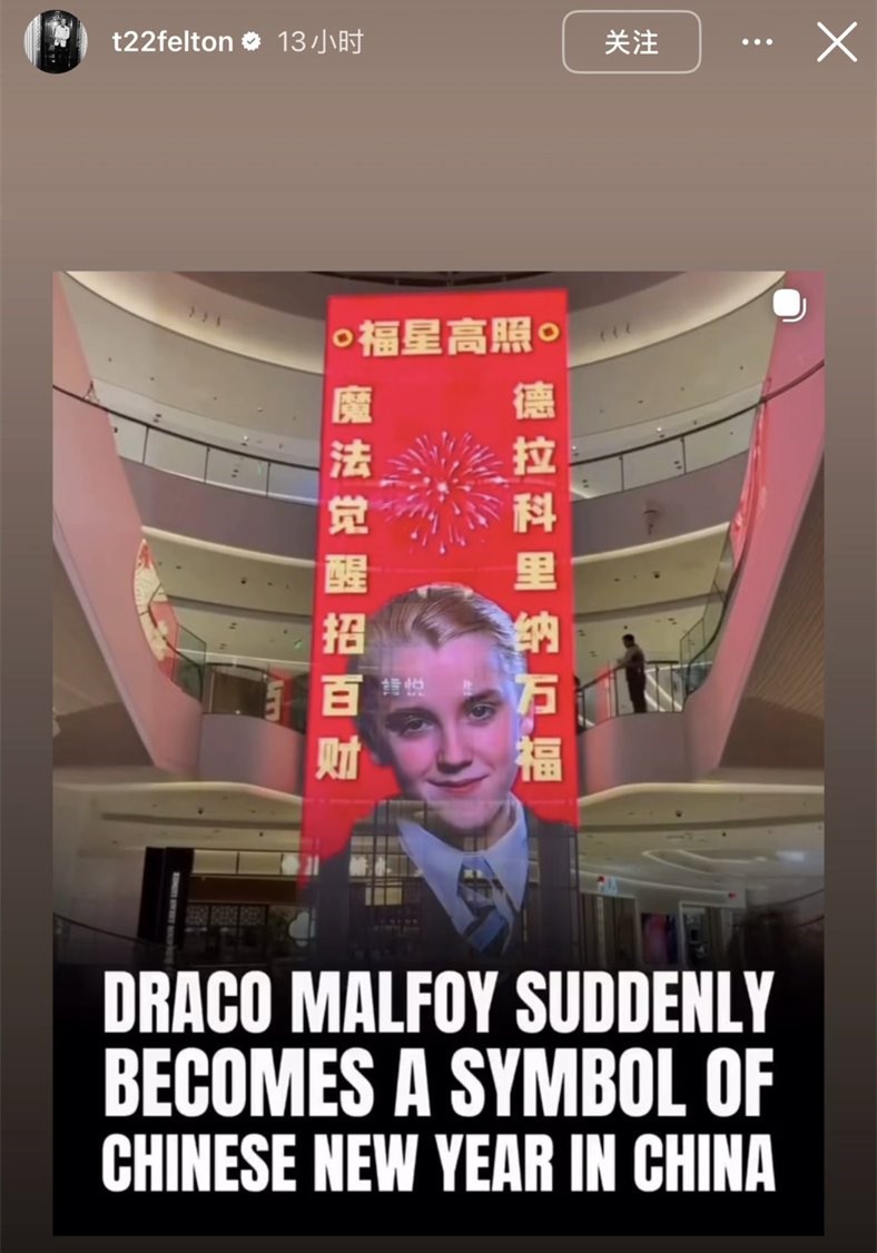 馬爾福扮演者社交賬號截圖 近日在中國社交媒體上,不少網友曬出帶有電影中馬爾福人物形象的春聯和“福”字。這些春聯和“福”字或張貼在家中,或出現在辦公室、商場等場所。相關產品也在中國的電商平台上售賣。 有網友打趣道,“名字取得好,反派變主角”,“馬爾福果然和馬年很搭”。據悉,儘管馬爾福是《哈利·波特》中反派角色,但因其個性鮮明、電影版扮演者形象帥氣,其實在中國一直擁有很多“粉絲”。 事情可以追溯到上月,網友“文刀李”突發奇想,用馬爾福電影劇照設計了馬年福字,很快吸引了大量《哈利·波特》粉絲。“馬爾福”的諧音被許多中國網友解讀為“馬年爾等有福了”,相關文創產品由此誕生。 馬爾福扮演者、現年38歲的英國演員湯姆·費爾頓也關注到這一熱潮。當地時間2月3日,他在社交媒體上轉發了一則圖片動態,顯示帶有馬爾福角色的春節海報掛在中國一處商場內,下方的字幕寫著“德拉科·馬爾福突然成了中國新年的象徵”。(完) 【編輯:彭玉婷】