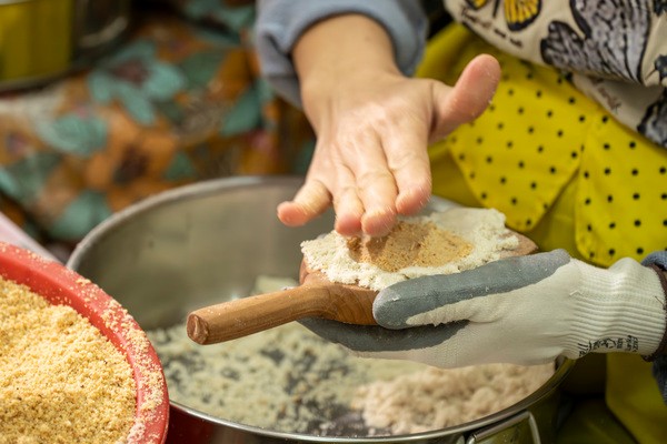 圖源:政府新聞網 炒米餅的材料簡單,只有粘米、花生、白糖和片糖,但步步講究。首先要把粘米炒至金黃香脆,然後放涼磨粉,加入用片糖煮成的黃糖水,搓揉成粉團。廖超華解釋,這些用作餅底的粉團也有標準,要做到一握成團,一推就散。餡料方面,要將花生炒香、去皮磨碎,再拌入白糖。廖超華憶述,早年製法和材料比例不一,成品質素參差,部分炒米餅硬得咬不動。 經過村民不斷改良,現在的炒米餅比以往更鬆脆,花生香味四溢,而炒米餅製作技藝也於2024年獲列入香港非物質文化遺產清單。 康樂及文化事務署轄下的非物質文化遺產辦事處,上月舉行工作坊及圍村導賞,廖超華親自帶領參加者走訪上水圍,介紹宗族春秋二祭、點燈儀式等非遺項目,並講解炒米餅和蕃薯餅的製作過程,讓參加者一嘗鄉村食品的滋味。(完) 【編輯:李濼】