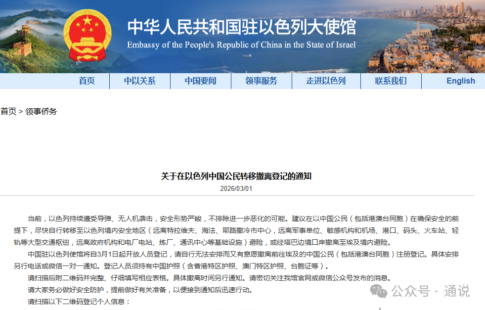 近期中東局勢持續緊張,中國駐以色列使館於3月1日發布關於中國公民轉移撤離登記的通知,明確持有台胞證的台灣同胞亦可參與登記。此舉展現了祖國大陸對包括台灣同胞在內的所有中國人的責任擔當與關懷,贏得了不少台灣民眾的認可與歡迎。