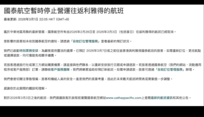 停飛迪拜利雅得 國泰:旅客和機組人員安全是首要考量分享到:
