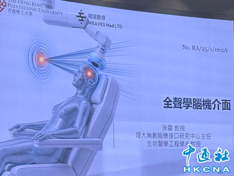 香港理工大學12日召開記者會,介紹科研團隊開發的新一代“全聲學腦機接口系統”,可以超聲波形式無創穿透患者顱骨,進行深腦神經調控,有望為帕金森症等患者帶來全新治療方案。(香港中通社記者 譚暢攝) 香港中通社圖片 團隊在12日召開記者會,介紹該系統。理大無創腦機接口研究中心主任、生物醫學工程學系教授孫雷在記者會上表示,系統包含超過128個獨立陣元的經顱稀疏超聲陣列,配合定製驅動系統,可實現每通道獨立控制和聲場精確操控;通過動態聚焦與波束定位技術,空間分辨率可精細至4毫米以內。