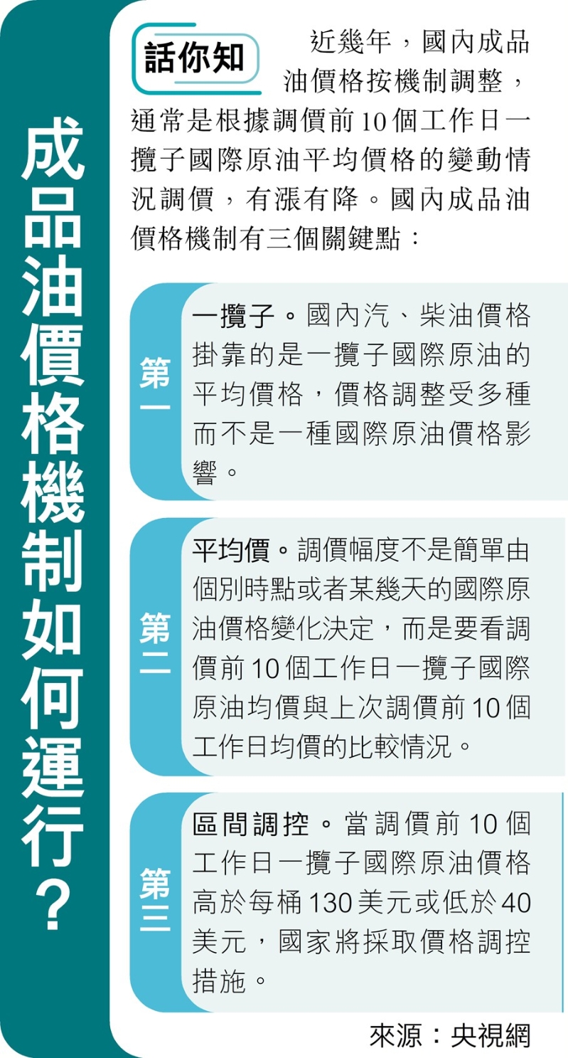 國家發展改革委價格成本和認證中心副處長呂指臣表示,現行國內成品油價格機制設置了每桶130美元的價格調控上限,如果一攬子國際原油的平均價格繼續大幅上漲,超過每桶130美元,也就是對應的國內成品油價格(92號汽油平均零售價格)略高於每升10元,將觸發價格調控上限,對於超出上限的部分,國內汽、柴油最高零售價格將不提高或少提高,同時為了穩定供應,國家可能會採取一些財稅支持政策。從以往情況看,2022年俄烏衝突曾引發國際油價大幅上漲,國家當時明確當國際油價突破每桶130美元的調控上限後,國內成品油價格短期內不再上調,通常為不超過兩個月,並對煉油企業給予階段性補貼。 中國石油大學(北京)教授、中國海油集團能源經濟研究院院長王震接受媒體採訪指出,此次國家對成品油價格的調整,既按現行機制實時調整,又結合當下中東地緣政治推動的油價波動過高,實際控制了調價幅度,這是應對國際油價劇烈波動的及時有力舉措,既堅守了市場化定價機制,又充分體現了民生保障與經濟穩增長的導向,是特殊市場環境下的務實舉措。 王震認為,國際油價異常暴漲必然會傳導至國內,抬升國內用油成本,按照現行成品油價格機制的正常測算,此次汽、柴油價格的上調幅度本會顯著偏高,而過高的調價幅度會直接加重下游行業與居民負擔,不利於經濟平穩運行和民生穩定,這也是國家出台臨時調控措施的核心考量。 在王震看來,此次調控最關鍵的價值體現在完全保留現行價格機制框架的基礎上,通過臨時調控合理壓縮調價幅度,這種做法既遵循目前掛鈎的市場化核心原則,又實現了減負效果。每噸少漲的金額對應到每升、每箱油,能切實降低居民出行成本,對營運車輛等群體的減負作用更為突出,真正做到了兼顧機制與民生。 王震分析認為,未來國際油價仍可能因地緣政治局勢變化保持高位波動,而國家後續仍會持續完善價格機制,根據市場實際變化靈活調整調控力度,持續兼顧市場化原則與民生保障,進一步築牢國內經濟高質量發展的能源價格安全屏障,確保油價巨幅波動對經濟社會平穩運行影響程度可控。