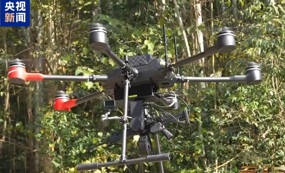 機器狼。(央視視頻截圖,下同) 廢墟之上,這些機器狼能以每小時15公里的速度奔跑,背著微型導彈和榴彈發射器,在山地斜坡衝鋒,在城市巷道滲透,跨越台階和窪地簡直如履平地。更科幻的是,它們之間能共享視野,協同決策。操控它們的士兵可通過語音指令、手勢識別、槍械聯動來下達任務。在三聯屏指揮終端,士兵從前線搏殺者變身為了戰術節點的指揮官。 有意思的是,和機器狼群配合出場的,還有“無人飛槍”。別誤會,它可不是簡單的無人機+槍,而是通過火控和飛控聯動融合實現跟蹤和瞄準。飛槍的出現,打破了傳統小微型無人機只能少量投彈或自殺式攻擊的“單程票”局面,實現了長航時伴隨打擊的作戰升級。