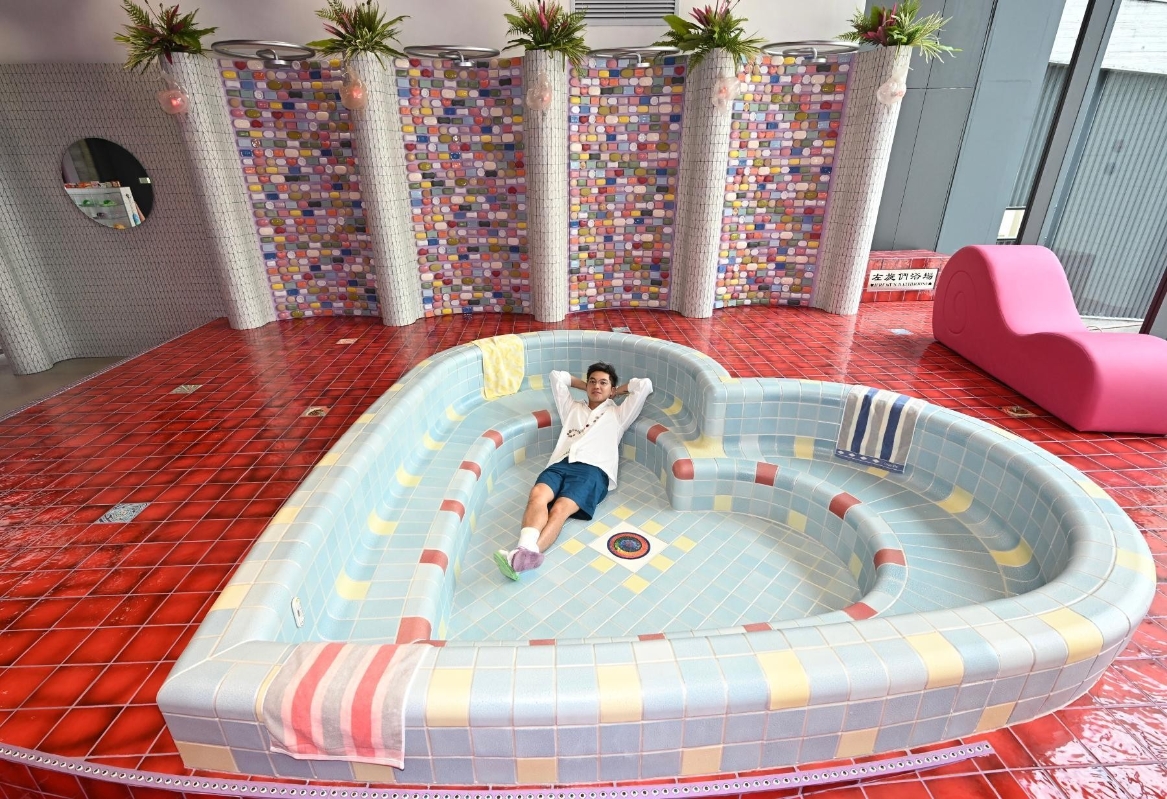 場域特定裝置《左旋之心》由1200多塊手工陶瓷磚組成心形設計,藝術家親身到景德鎮學習陶瓷燒製技藝,為展覽製作專屬的瓷磚和紋飾。心形外觀喚起對愛與浪漫的直觀聯想之外,藝術家邀請參觀者走進浴池,更邀請你穿上拖鞋模擬進入浴場“浸浴”前的儀式感。空間設有另一個裝置作品《七彩肥皂》,牆上展示的不同顏色的陶瓷肥皂,隱喻人際相處間個體的獨特性與群體共存的多元樣貌,空間氣氛會隨時間而變化,定時釋放霧氣效果,在展廳營造出時而朦朧的視覺效果,塑造出沉浸式感官體驗。